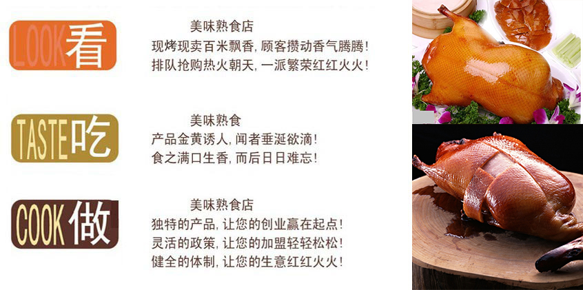 3.北京烤鴨能根據(jù)不同的地域改變口味嗎? 答:北京烤鴨品牌店的口味是不能隨意改變和調(diào)配的,如果改變了口味,它就不是北京烤鴨品牌店,就失去了北京烤鴨的特點(diǎn)特色,也就成了百店百個(gè)樣,千店千個(gè)樣,那么你加盟北京烤鴨品牌店也就失去了任何意義。
