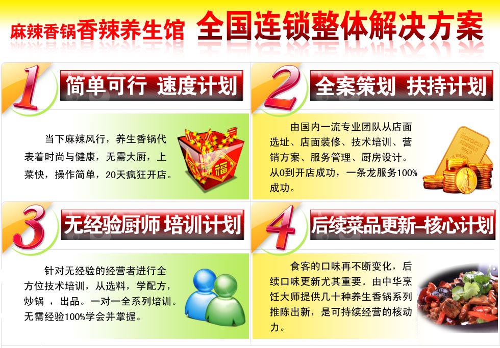 術(shù)培訓(xùn)、整體形象設(shè)計(jì)、店面設(shè)計(jì)、開業(yè)指導(dǎo)、市場督導(dǎo)、個(gè)性化跟蹤服務(wù)、定期升級服務(wù)。 2.培訓(xùn)內(nèi)容:麻辣香鍋極品鍋、麻辣香鍋精品鍋、麻辣香鍋?zhàn)萄a(bǔ)鍋、麻辣香鍋山珍菌鍋麻辣香鍋鴛鴦鍋
