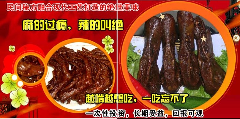 怪味黑鴨子,以黑、麻、辣聞名全國,香味純正,色澤光亮,酥香入骨,肉質(zhì)鮮嫩,肥而不膩,瘦而不柴,營養(yǎng)豐富,健胃扶脾,美容美體,保健強身,可補充人體所需的多種微量元素,老少皆宜,是人見人愛的大眾休閑食品,經(jīng)常食用,效更佳! |