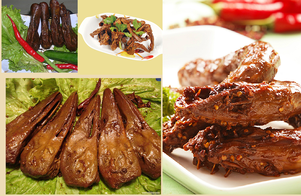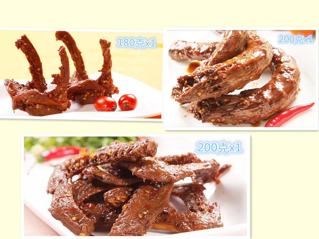 的全套技術(shù),函授費用2000元。 周記黑鴨 學(xué)習(xí)的品種有: ◎整鴨系列:新一代周記黑鴨、新一代醬板鴨、新一代鹵全鴨。 ◎鴨付系列:鴨脖、鴨頭、鴨掌、鴨翅、鴨腸、鴨肝、鴨排、鴨鎖骨、鴨心、鴨食管、鴨舌等等。 ◎雞系列:
