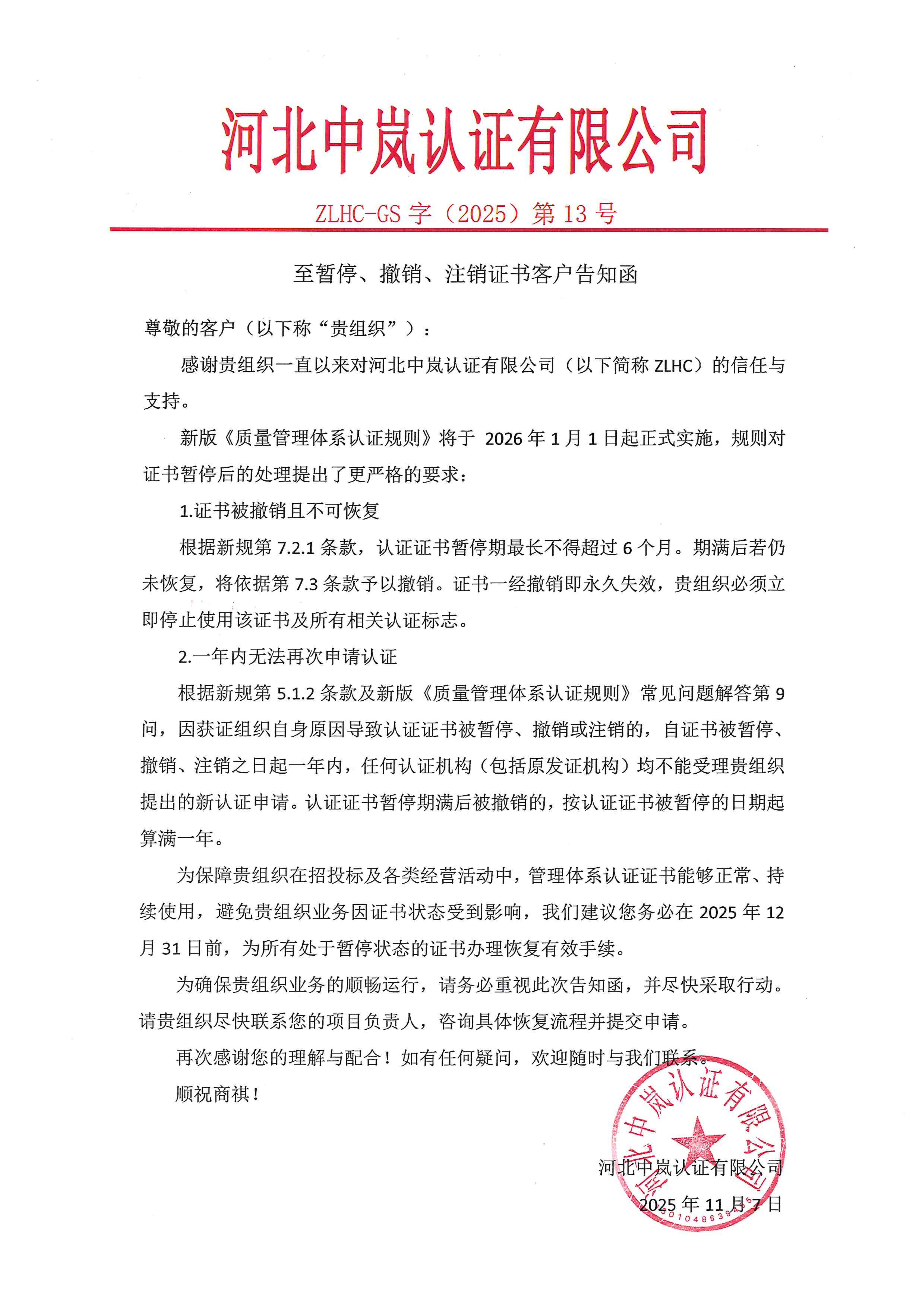 2025年11月7日至暫停、撤銷、注銷證書客戶告知函